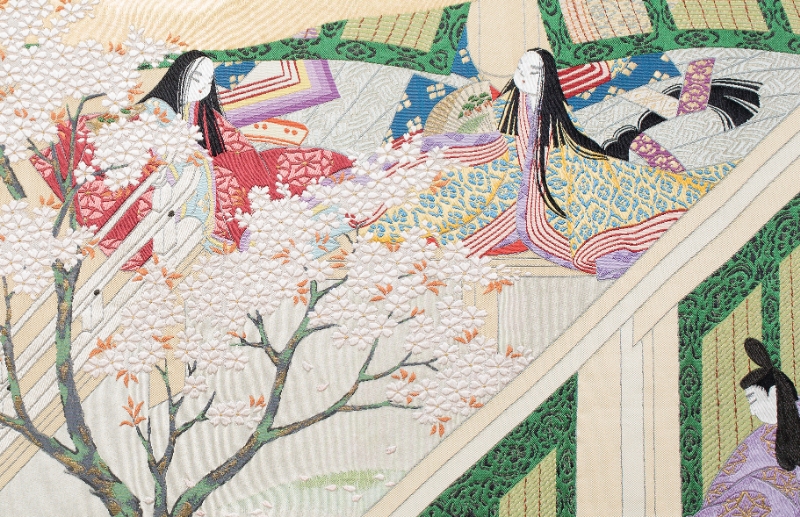 ただ粗いデジタル画像のようなものですから、細い筆線や色のにじみ、ぼかしを表現するのが非常に難しい。例えば若木の梅の伸びやかな幹の曲線を立体的に、陰影もつけて表現しています。微妙に違う複数な色の細い緯糸を、通常の3倍の織り密度で織り込んでいるんですね。逆に桜花は太めの糸で密度を粗く織り、ふっくらした感じを出しています」