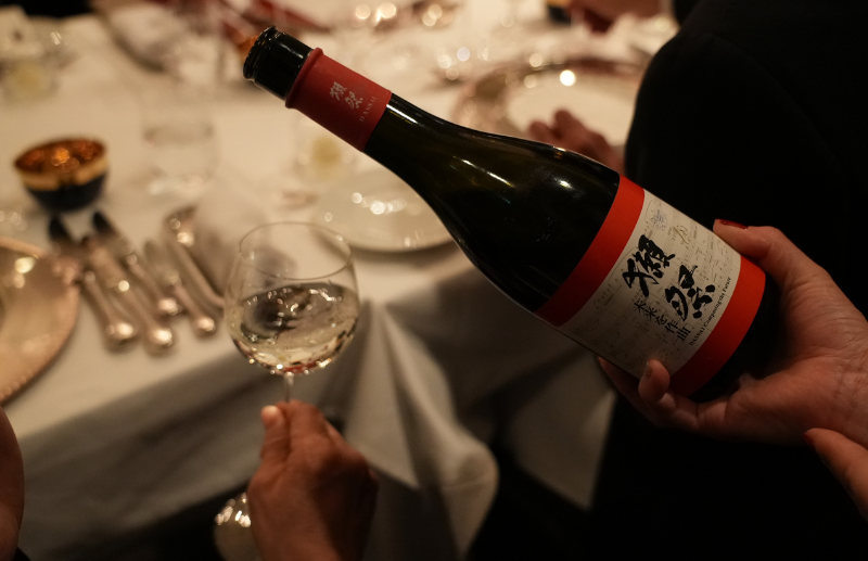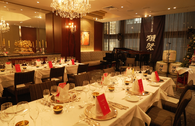 獺祭にとっても初めての試みは、まさに「未来を作曲」というテーマにふさわしいではないか。そしてそのご縁を機に、オーストリアを代表するガラスメーカー、ロブマイヤー社と陶磁器メーカー、アウガルテン社と共同でオリジナルのグラスと酒器を製造。こうした国を超えた文化交流の意義を伝えたいと、去る、12月26日に正統派のオーストリア宮廷料理を供する「銀座ハプスブルク」で音楽、日本酒、酒器、料理のコラボレーションを楽しむ晩餐会が開かれた。生演奏を聴きながら、美酒と美味のマリアージュを楽しむ、なんとも贅沢な会となった。ロブマイヤーのオリジナルのグラスでは「獺祭 未来を作曲」の香りが華やかに弾け、アウガルテンの酒器では「獺祭 未来へ 農家とともに」をじっくり味わうという、コラボレーションの魅力をいかんなく発揮する趣向がこらされた。こうした海外との交流がますます獺祭の酒造りの幅を広げ、磨いていくのであろう。